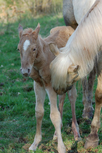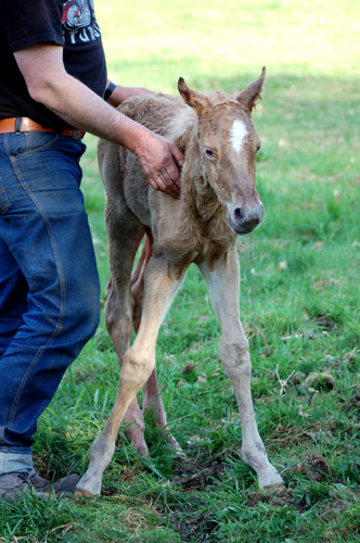 Sein Papa ist Colonel Good Times (ein Colonel Freckles Sohn) und die Mama ist Tiger Leo Dolly, ein Mordspferd. Wir holen morgen alles nach - aber erst sehen wir mal zu, dass der kleine seine erste Milch bekommt.