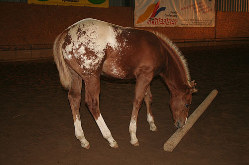 Insgesamt stellten sich 6 Stuten, 1 Jährling, 1 Wallach und 29 Fohlen den kritischen Augen der Richter. Das dürfte damit wohl die größte Appaloosazuchtschau in Deutschland gewesen sein. Erfreulich war, dass die 29 Fohlen auf 14 Hengste zurückgingen, so dass auch eine Streuung vorhanden war.