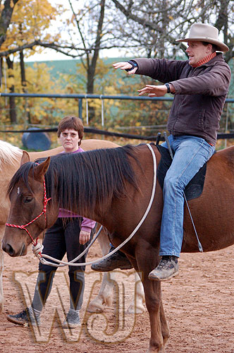 (S. Alfs) Der Mann mit dem Cowboyhut ist Honza Blahe, der für einen einzigen Kurs zu Martina Knapp (Pferdeparadies Lindenhof) nach Frohnhofen kam. Er schwingt sich gerade auf einen mittelschweren Haflinger und demonstriert, dass auch er seinen Rücken sichtbar heben kann. Sein Internetauftritt ließ leider nicht näher auf sein Trainingskonzept schließen, auch hat der gebürtige Tscheche noch kein Buch veröffentlicht, in dem er seine Ansätze der Horsemanship erläutert. So kamen wir völlig unvoreingenommen zu dem Horseman, der uns u.a. erklärt, dass es so viele verschiedene Möglichkeiten und Lösungsansätze in den unterschiedlichen Situationen gibt, dass man dies unmöglich auf 120 Seiten dem Leser verständlich machen könne.