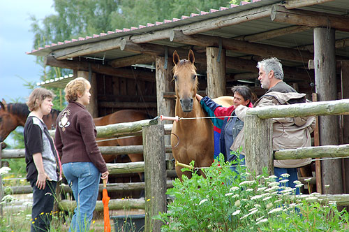 Auf dem Außenplatz der Ranch ging es nach einer Mittagspause weiter, wo sich der Tierarzt nun den mitgebrachten Pferden widmete. Unter ihnen befand sich das wohl beste Beispiel einer verkorksten Ausbildung unter schlechter Reiterhand. Das Pferd „Wolkentänzer“ war mit seinen ihm eigenen Problemen ein Produkt der Rollkur und einer aggressiven Reitweise. Das Pferd hatte zum Glück vor wenigen Monaten ein neues gutes Zuhause gefunden und nun bemüht sich die Besitzerin, das gequälte Tier von seinen Phobien zu heilen.