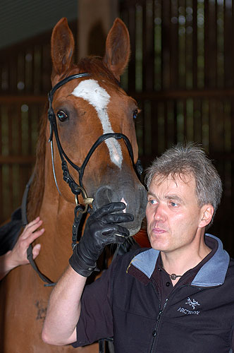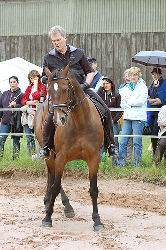 Dr. Heuschmann lies das Pferd erst von seinem Besitzer vorreiten. Der Wallach war vom Kopf bis zum Schweif hart wie Beton, das war auch für das ungeübte Auge klar erkennbar.