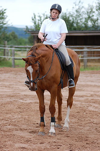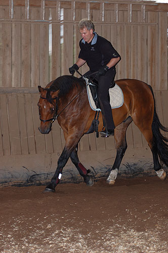 Der Pferdefreund machte sich mit dem Tier vertraut und ließ es zunächst einflusslos einige Runden drehen. Ganz langsam tastete er sich an das misstrauische Tier heran, versuchte es an das Bein zu gewöhnen, es zum Seitwärtstreten zu bewegen, um die innere Hinterhand zu kräftigen.