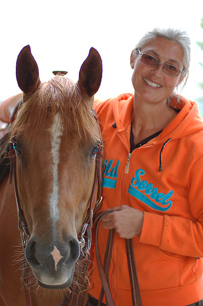 Elke Diebold - strahlende Kursveranstalterin mit Quarter Horse Wallach Smoky