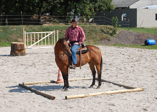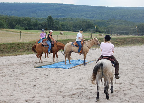 Auf dem großzügigen Außenplatz hatten die Leute vom Hofgut Bergfrieden jede Menge Hindernisse aufgebaut, die von den Teilnehmern und Pferden erst mal inspiziert und später auch in Angriff genommen wurden. Man durchritt das Tor, überquerte eine Plane, nach dem Stangen-L ging es dann ans Lassowerfen. Neu für viele Pferde war auch das Hinterherziehen eines Stammes. Erfahrene Reiter halfen hier den Unerfahrenen und die gemeinsame Arbeit sorgte für viel Spaß aber auch Lehrreiches.
