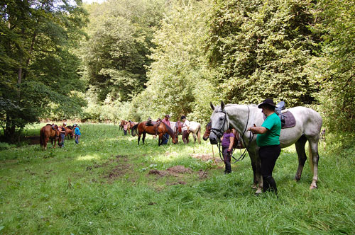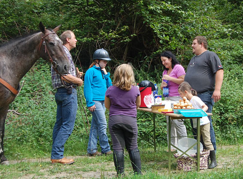 Auf halber Strecke wartete schon das Verpflegungsteam und lud zu einer Lunchpause im Grünen ein. Dann hieß es wieder „Aufsitzen“ und der Ritt ging in ruhigem Tempo weiter, immer der Pferdenase nach. So verging die Zeit wie im Flug und nach einer weiteren Pause mit Kaffee und Kuchen machte sich die Gruppe wieder auf den Heimweg.