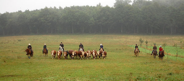 Dann kam das, worauf alle fiebrig gewartet hatten: es ging zu den Kühen. Die Reiter mussten erst einmal die Kühe lesen lernen. Die Gruppe ritt in sicherem Abstand um die Kühe und cattlete die Rinder. Dann wurden die Tore zu den riesigen Koppeln geöffnet und man ließ die Herde flankiert von den Reitern gemütlich voran ziehen. In der nächsten Stufe ritt immer ein einzelner Reiter durch die Herde durch. Das sollte für den Vormittag erst mal genügen.