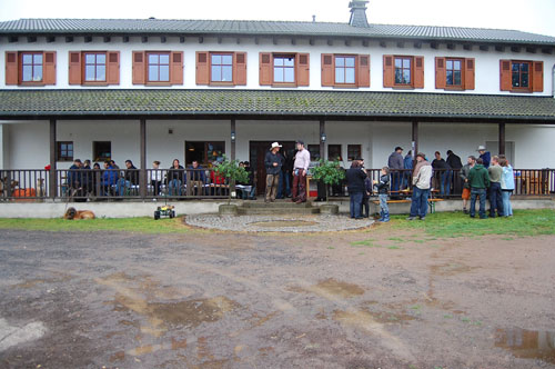 Aber am 14. August 2010 war dann alles bereit und auf dem Hofgut wartete man auf die einrollenden Pferdeanhänger nebst ihren Insassen. Die Teilnehmerschar waren eine gute Mischung aus Western-, Freizeit- und Jagdreitern und so füllte sich der Hof, von dem es dann gegen 11.00 auch schon losging. Die Route des Trails führte durch die schöne Landschaft der Veldenzer Umgebung, durch die Heidenmauer (Vorchristliche, keltische Fluchtburg)