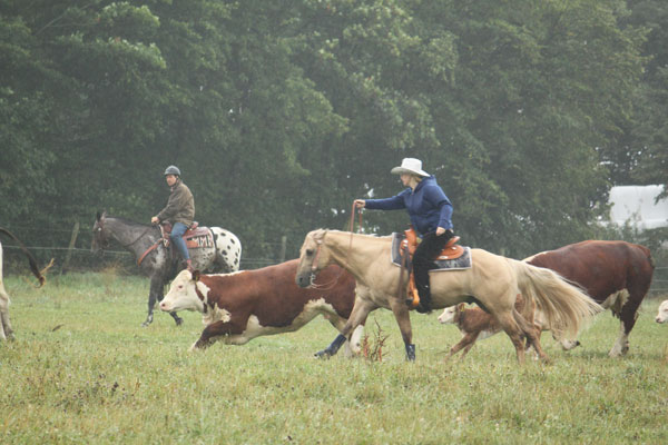 Der Sonntag zeigte sich leider von einer regnerischen Seite, doch das sollte die Teilnehmer und jede Menge begeisterte Zuschauer nicht davon abhalten, sich der Rinderarbeit zu widmen. Dabei galt es erst einmal für alle Beteiligten, den Ranchtrail hinter sich zu bringen, um so die Voraussetzungen für echte Rancharbeit zu schaffen.
