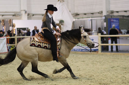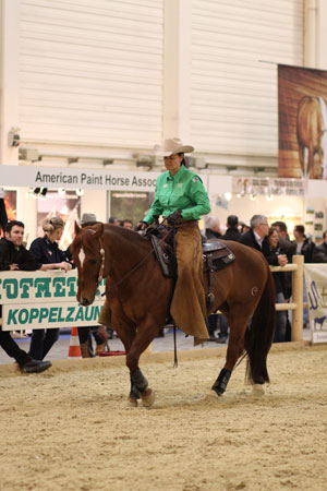 Um den Messebesucher einen umfassenden Einblick in den Westernsport zu ermöglichen und die vielseitigen American Quarter Horses zu präsentieren, demonstriere Diana Royer von der Five Star Ranch täglich verschiedene Lektionen. Mit dem erfolgreichen Turnierpferd „Remmy Demmy“, der 2008 und 2009 die Maturity in Western Riding gewinnen konnte, zeigte sie wie ein perfekter fliegender Wechsel aussehen soll und die dazugehörige Vorbereitung des Galopps. Um den gesamten Ausbildungsverlauf umfassend darzustellen, wurde jeweils noch ein weiteres Pferd vorgestellt, das in seiner Ausbildung noch nicht so weit fortgeschritten ist. Mit ihm wurden die einzelnen Etappen und Übungen gezeigt, um den fliegenden Wechsel zu erlernen und zu verfeinern. So konnten die kleinen „Testreiter“ ihre neuen Lieblingspferde auch gleich in Aktion erleben und bestaunen.