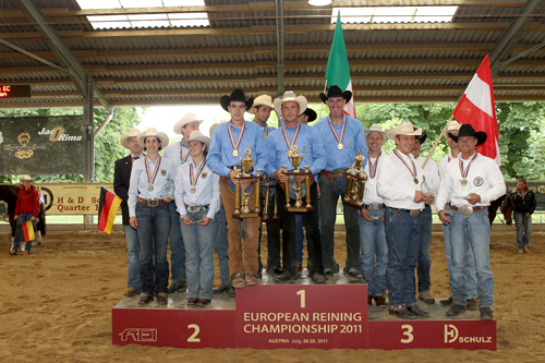Zum zweiten Mal am gleichen Tag ertönte bei der FEI Europameisterschaft Reining in Wiener Neustadt die italienische Nationalhymne: nach Gold bei den Junioren wurde Italien Mannschaftseuropameister. Mit insgesamt 662,5 Punkten setzten sie sich gegen Deutschland (Silber mit 656,5 Punkten) und Gastgeber Österreich (Bronze mit 652,5 Punkten) durch. Frankreich wurde mit einer 647 Vierte vor Belgien (640) und der Schweiz (632,5).